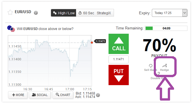 In order to successfully execute a hedging trade, you first need to have a profitable trade open, that you are afraid might end up in a loss. Suppose you have invested a total amount of $200 on a Call option and the price indeed does go up and you want to use hedging. Normally you would open a Put position with the same amount ($200) Let’s assume you are getting a payout of 80%.